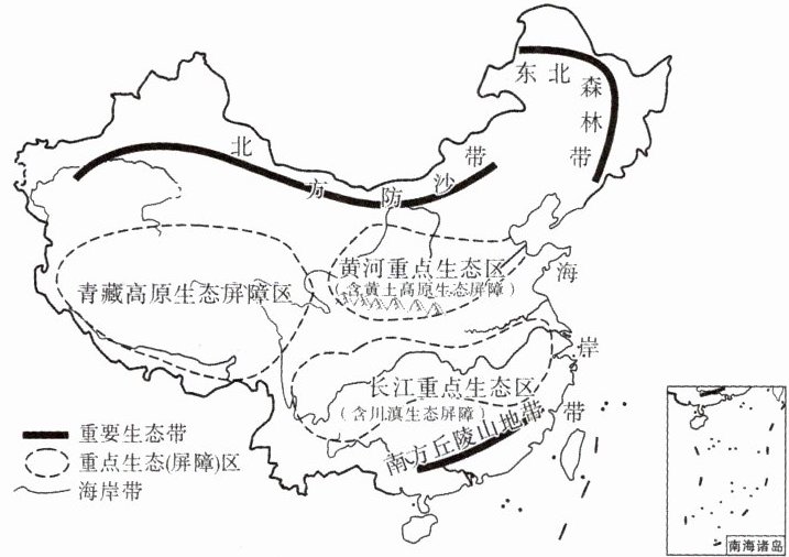 (4)结合地图,任选我国两个生态系统保护和修复重大工程,写出该区域内可能的生态修复措施。(2分)