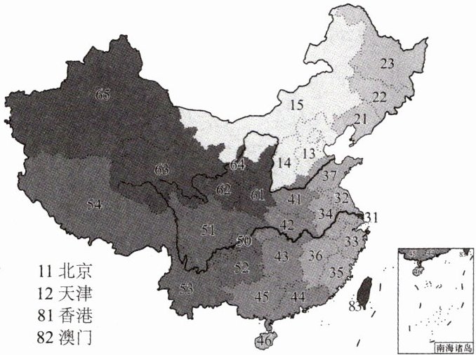 身份证号码包含公民户籍所在地、出生日期、性别等重要信息。其中前两位数字代表省区,第一位代表各省传统上所在的大区,第二位代表大区内具体的省份。读各省身份证号码前两位示意图,完成 11~13 题。