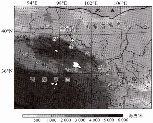 甘肃省高台县靠近祁连山,年日照充足,域内滩大湖广,天然水草等饵料种类繁杂丰富,水中富含多种矿物质。高台螃蟹因其质优“早熟”,高质高钙,远销海外多个国家和地区。读高台县位置示意图,完成 1~2 题。