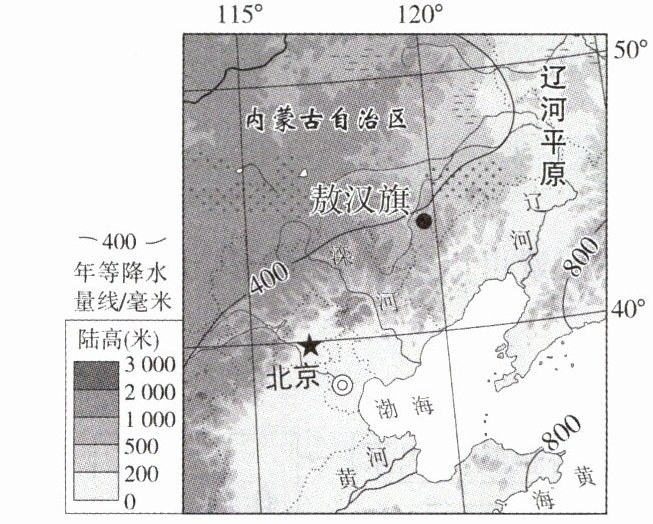 小米喜温,海拔 1000 米以下均适宜种植,属于耐旱稳产作物。敖汉小米为全国“农遗良品”优选计划十佳品牌,种植历史延续近 8000 年,是内蒙古自治区敖汉旗杂粮种植业中的优势品种和地方特色产品。读敖汉旗位置示意图,完成 3~4 题。