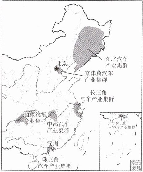 1969年后,我国汽车产业发展迅速,经过多年发展在全国形成了六大汽车产业集群。读我国汽车产业集群分布图,完成4~5题。