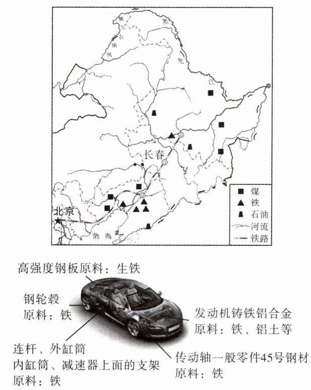 1. B 2. A 【解析】本题考查我国第一汽车制造厂选址在长春的主要原因。读图并结合所学可知,长春靠近东北地区的铁矿产地,钢铁原料充足,生产汽车成本低;长春工业发展起步早,钢铁、机械等传统工业基础好,有利于汽车制造产业的发展;长春有铁路线经过,交通便利,便于原材料的运入和工业产品的运出;长春位于内陆地区,不临海。 3. D