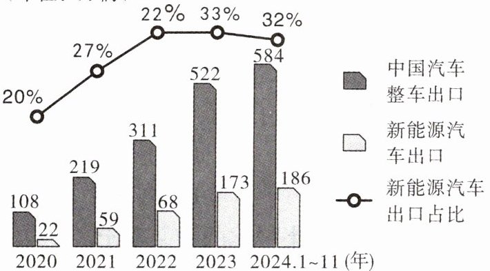 材料三 2020—2024 年中国汽车出口量图。(单位:万辆)