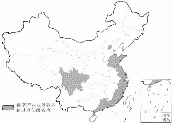 数字产业集群是从事数字产品制造和服务、发展数字技术应用、通过数字要素驱动、实现数字化效率提升的企业及关联机构竞合共生而形成的产业生态组织,是以数字产业为主体的集群。读数字产业业务收入规模超过万亿级的省市分布图,完成1~3题。