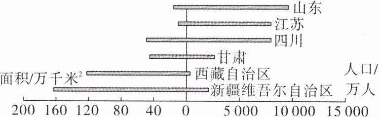 (教材活动改编)人口分布受社会条件、自然条件和开发时间(文明程度)等因素影响,在一定时期内人口分布密度呈现地区差异。读中国部分省级行政区面积及人口数量图,完成7~8题。