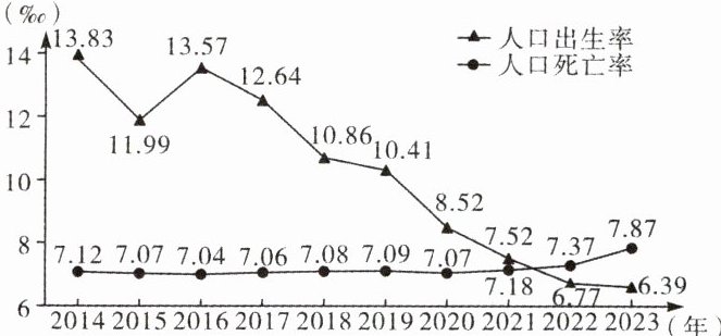 (黑白卷改编)截至2024年末,我国人口自然增长率连续三年达到负值。读我国人口出生率及死亡率统计图,完成5~6题。