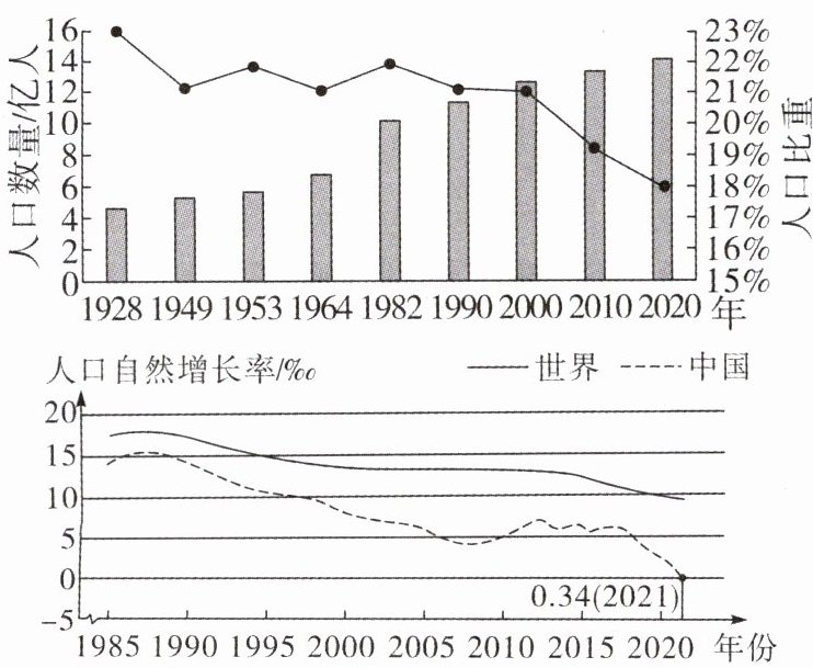 (教材阅读改编)2020年,世界人口达77.53亿人,我国人口约占世界人口总量的18.57%。读我国人口数量及占世界人口比重的变化图、我国和世界人口自然增长率图,完成3~4题。