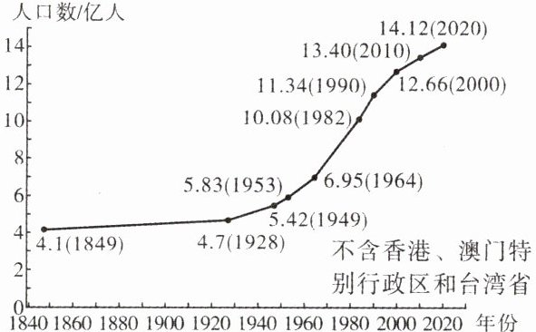 1949年到21世纪初,我国人口始终保持高增长。读1849—2020年我国人口增长示意图,完成1~2题。