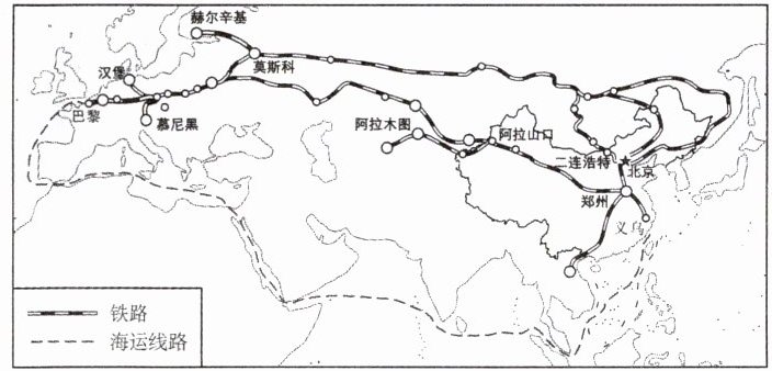 2024 年 3 月 1 日,一列装载有中法文化交流瓷器等艺术品的中欧班列,从义乌铁路口岸鸣笛启程,20 天后最终抵达法国巴黎。读瓷器运输路线图,完成 6~7 题。