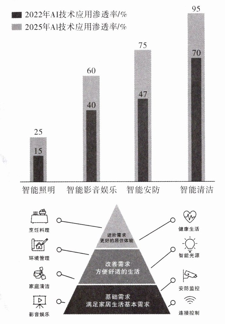 智能家居系统是利用先进技术,融合个性需求,将与家居生活有关的灯光、窗帘、煤气阀控制等有机地结合在一起,实现“以人为本”的全新家居生活体验。读 2022 年和 2025 年我国智能家居品类 AI 技术应用渗透率和智能家居产品需求层次图,完成 13~14 题。