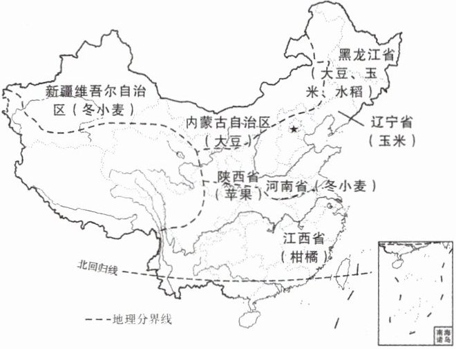 在2024年全国农业气候资源普查和农业气候区划试点工作中,工作组通过最初7个试点发现,多种作物的种植带已越过了原有界限,出现不同程度的“北移西扩”。读我国研究试点省区及农作物分布图,完成5~7题。