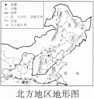 (1)A 东北平原 B 华北平原 C 黄土高原