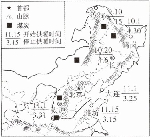 供暖是指向建筑物供给热量,是解决我国北方居民冬季采暖的社会服务。我国北方地区普遍实行集中供暖。读北方地区部分城市供暖日期示意图,完成3~4题。