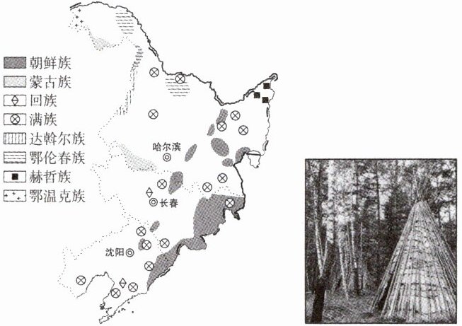 撮罗子是鄂伦春族的传统住宅,由20~30根木棍支建而成,冬季上盖兽皮,夏季上盖桦树皮,搭建便捷,移动方便。读东北地区部分民族分布图及撮罗子外观图,完成4~6题。