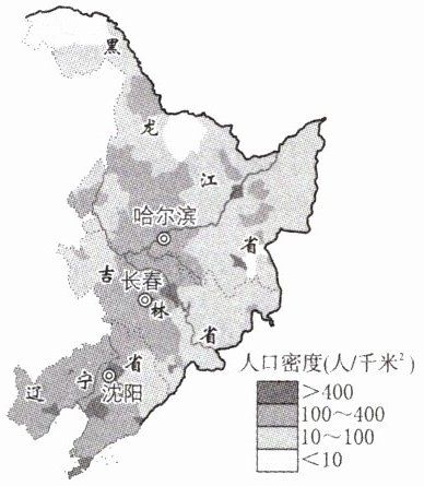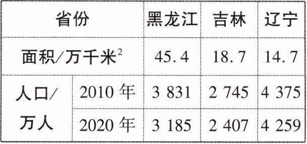 (教材活动改编)第七次人口普查相关数据显示,东北地区常住人口十年减少约1100万人,人口流失问题严重。读东北地区人口分布和东北地区面积与人口统计表,完成1~3题。