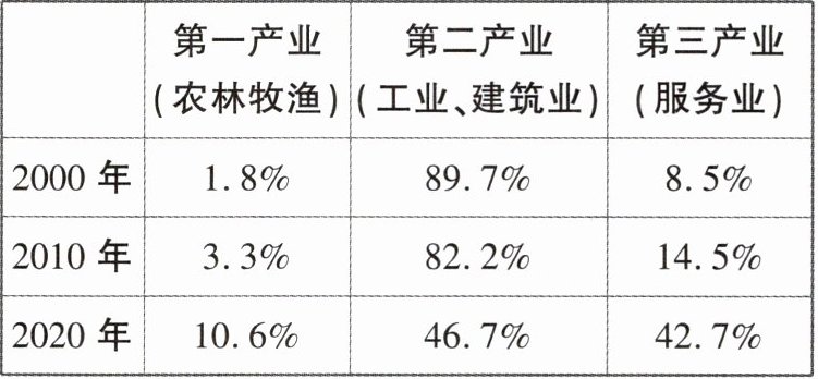 (1)石油产量先增后减。(1分) 第一、三产业比重上升,第二产业比重下降。(1分)