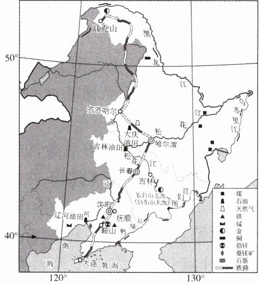 作为我国工业腾飞的基石和摇篮,东北地区形成了完备的工业体系,成为我国最早、最大的重工业基地。读东北矿产资源分布及主要工业中心分布图,完成8~10题。