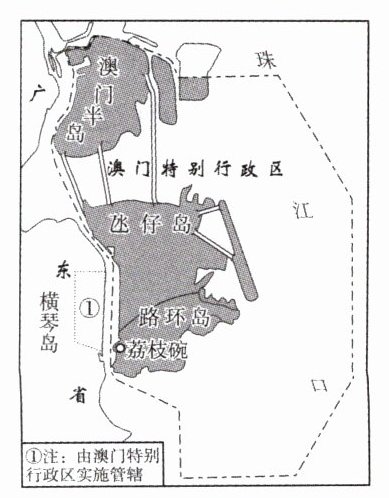 澳门曾经是繁荣的渔港,荔枝碗曾是其著名的造船基地,以建造木船为主。读澳门特别行政区示意图,完成3-4题。
