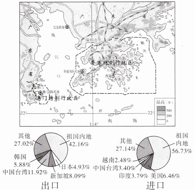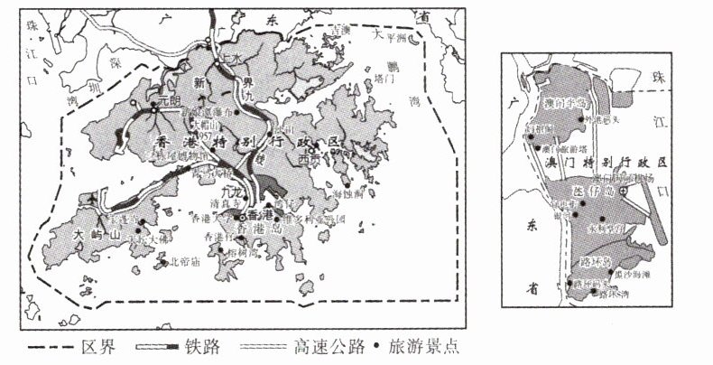 (3)内联:交通便利,与祖国内地经济合作紧密,政策支持。 外联:港口众多,便于发展对外贸易和金融业,与世界联系紧密。(任选一个角度作答,2分)