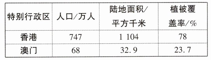 香港和澳门均是现代化的大都市,经济发展水平高,但也暴露出一些城市问题。读香港和澳门人口、陆地面积及植被覆盖率统计表( 2020年),完成8~9题。