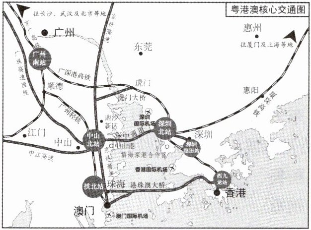 近年来,粤港澳大湾区跨江跨海通道建设快速发展。环珠江口“黄金内湾”现阶段规划9条通道,其中6条已经建成通车或即将通车,完善了粤港澳大湾区综合立体交通网络、推动大湾区实现一体化发展。读粤港澳大湾区核心交通图,完成6~8题。