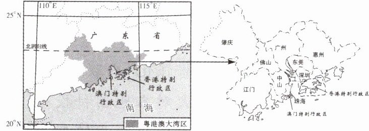 建设粤港澳大湾区是新时代推动形成全面开放新格局的新举措。如今,粤港澳大湾区“9+2”城市群已成为我国经济发展活力最为强劲的地区之一。读粤港澳大湾区简图,完成1~3题。