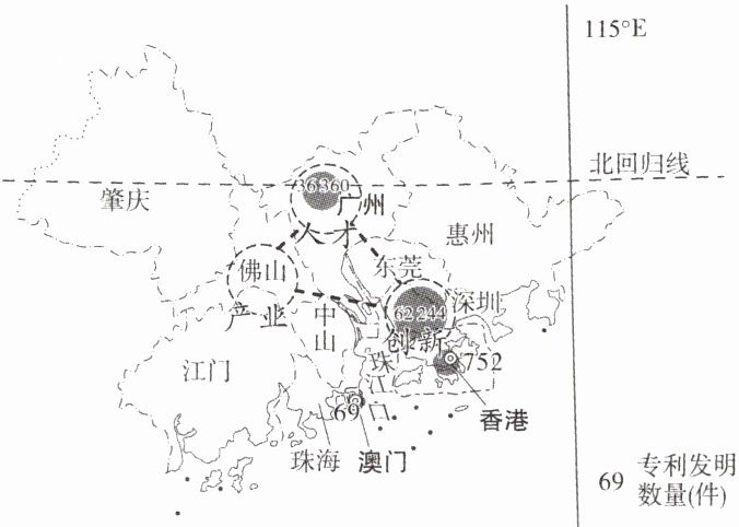 (教材图改编)粤港澳大湾区作为科技创新高地,深入实施创新驱动发展战略,一直走在全国乃至全球前列,有效发明专利逐年攀升。读粤港澳大湾区2023年部分城市专利发明分布及产业发展图,完成4~5题。