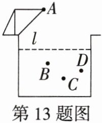 13. 日常生活情境 跳水训练 如图,l为泳池的水平面,一名运动员(看作一个点)从A点起跳,点B,C,D为他三次跳水落入水中的位置.以水面为基准,点A的高度记为+10米,点B的高度记为-1.1米,点A与点C的高度差为13.2米,点B比点D高1.2米.
