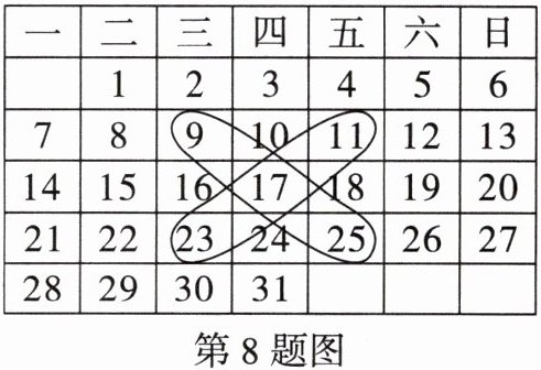 8. (教材素材改编)如图所示,用“X型框”去框月历中的日期数.