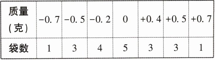 解:(-0.7)×1+(-0.5)×3+(-0.2)×4+0×5+0.4×3+0.5×3+0.7×1=0.4(克),
