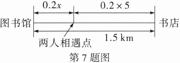 7. 小明和小亮在图书馆完成作业后,小明去书店买书,小亮继续留在图书馆.当他到书店后发现自己忘带钱包,于是他以5km/h的速度返回图书馆,同一时间小亮从图书馆出发去给小明送钱包,0.2h后两人相遇.已知图书馆和书店相距1.5km,求小亮的速度.