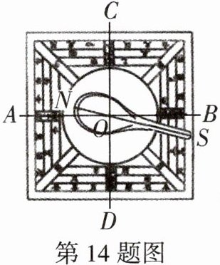 14. 传统文化情境 中国四大发明 司南是我国最早的磁性指向器,方向改变,磁勺就会转动,其勺柄始终指向南方,简易图如图所示,磁盘上的直线AB,CD和磁勺NS的连接点是点O,且$∠AOD= 90^{\circ }$.当磁勺NS绕点O旋转到如图所示的位置时$∠DOS= 75^{\circ }$,则$∠BON$的度数为____.