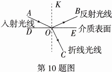 10. 跨学科情境 物理光的折射与反射 如图,一束光线$AO照射到某种介质表面DE$时,发生了折射和反射现象.已知$∠AOK = ∠BOK$,$∠KOE = 90^{\circ}$,若$∠COE = 65^{\circ}$,$∠BOE与∠COE$互余,则$∠AOK$的度数为______.