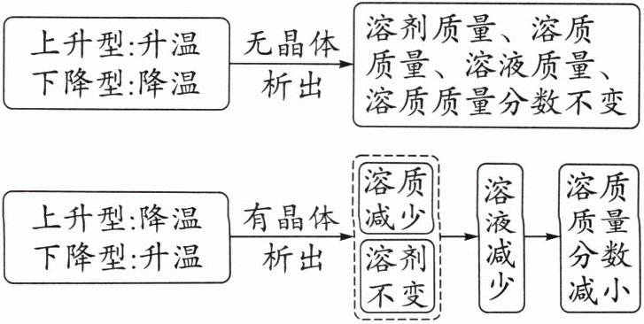 溶液质量:$NaCl\gt KNO_3$($KNO_3$析出晶体多,溶液质量减少多)。