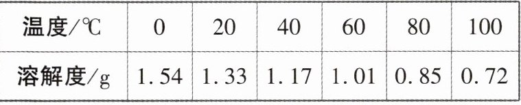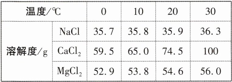 (2)分析表格数据,可知在 20℃时三种物质的溶解度大小关系为氯化钙>氯化镁>氯化钠,因此要在 20℃时配制符合要求的这三种溶液,需要固体质量最小的是氯化钠。