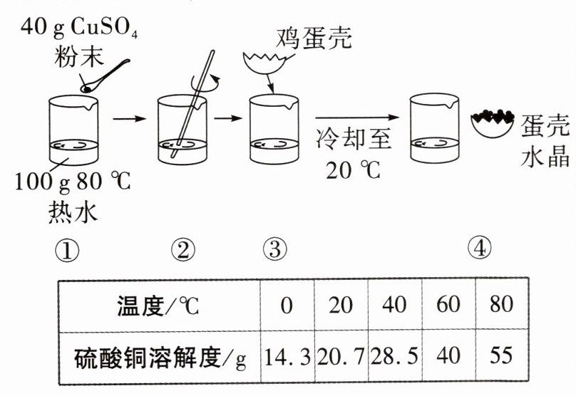 3. 趣味实验 自制蛋壳水晶 同学们在实验室制作“蛋壳水晶”工艺品,如图。硫酸铜的溶解度数据如表所示,下列相关说法正确的是(