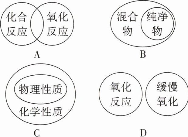A 【解析】化合反应与氧化反应属于交叉关系,A正确;混合物与纯净物属于并列关系,B错误;物理性质与化学性质属于并列关系,C错误;氧化反应包括缓慢氧化,D错误。