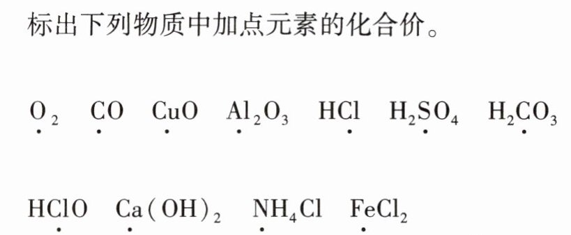 $\overset{0}{O}_{2}$ $\overset{+2}{C}O$ $\overset{+2}{Cu}O$ $\overset{+3}{Al}_{2}O_{3}$ $\overset{-1}{HCl}$ $H_{2}\overset{+6}{S}O_{4}$ $H_{2}\overset{+4}{C}O_{3}$ $\overset{+1}{HCl}O$ $\overset{+2}{Ca}(OH)_{2}$ $\overset{-3}{NH}_{4}Cl$ $\overset{+2}{Fe}Cl_{2}$