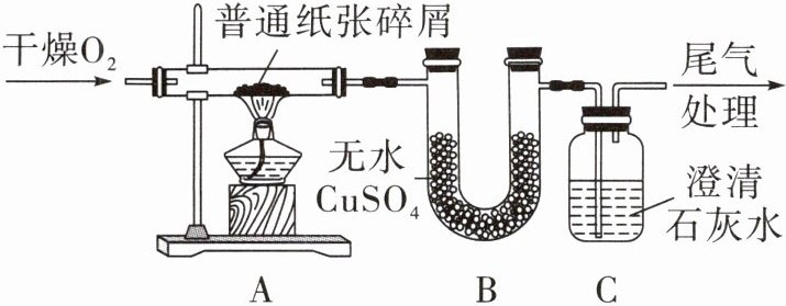 实验步骤:连接装置,检查装置气密性,装入纸张样品并按上图进行实验。通入$O_2,$一段时间后,点燃A处酒精灯。