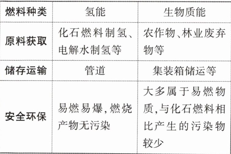 (4)氢能:①优势:储存运输方便,清洁无污染;②不足:安全性低,遇明火容易爆炸。生物质能:①优势:来源广泛,成本较低;②不足:储存和运输不便,不充分燃烧时会产生有害气体(合理即可)