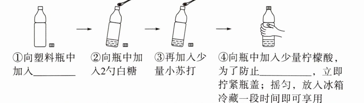 【解析】由图示可知,步骤①是向塑料瓶中加入凉开水。柠檬酸与小苏打反应会产生二氧化碳气体,步骤④中加入柠檬酸后,为防止汽水溢出,要立即拧紧瓶盖。