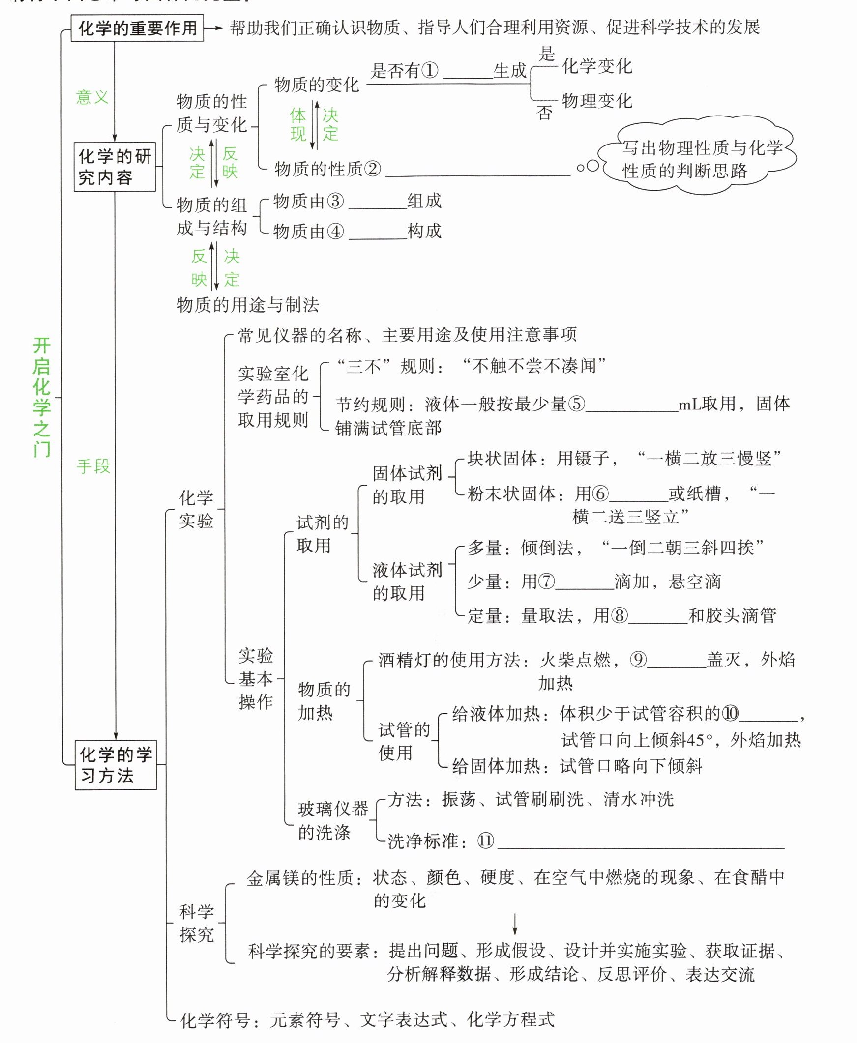 ①新物质 ②是否需要发生化学变化才能表现出来 ③元素 ④微观粒子 ⑤1~2 ⑥药匙 ⑦胶头滴管 ⑧量筒 ⑨灯帽 ⑩三分之一 ⑪内壁附着的水既不聚成水滴,也不成股流下