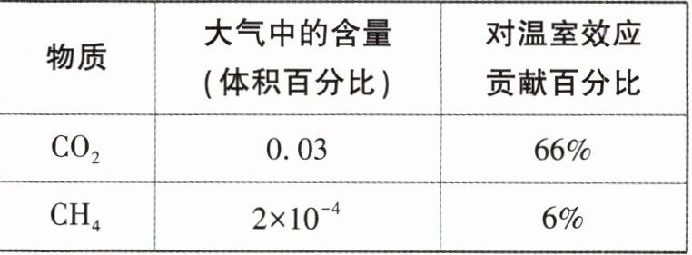 (1)同学们查阅资料了解到${CO_2}和{CH_4}$的含量均会引起地球表面温度的变化,同时${CH_4}的温室效应比{CO_2}$强。已知大气中${CO_2}$、${CH_4}$的含量及对温室效应贡献百分比如表所示。请根据下表分析${CO_2}比{CH_4}$对地球温室效应的贡献大的主要原因______。