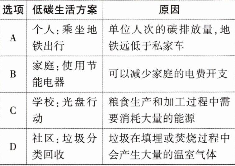 2. (黑白卷改编)化学小组设计的低碳生活方案以及对应的能够减少排放二氧化碳的原因如下表所示,其中不正确的是 (