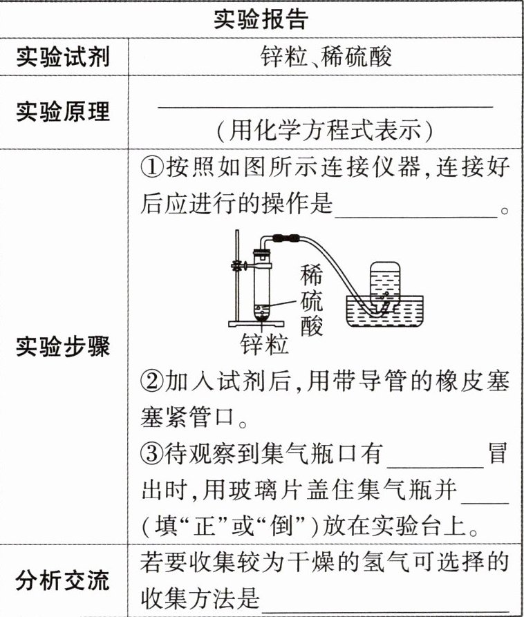 4. (中考新考法·撰写实验报告)同学们完成了实验室制取氢气的实验,请你一同参与完成下列实验报告(氢气密度比空气小,难溶于水)。