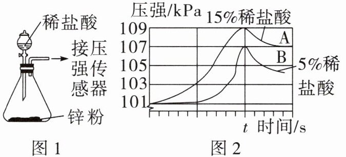 (中考新考法·数字化实验)小组同学利用图1装置进行实验,将2份等质量且过量的锌粉分别与等体积、浓度分别为5%和15%的稀盐酸反应。测得两次实验中压强随反应时间的变化关系如图2所示。