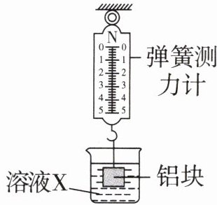 9. (中考新考法·跨物理浮力)如图,将悬挂在弹簧测力计上打磨光亮的铝块浸没在某溶液中,溶液体积变化忽略不计。烧杯中盛放下列溶液时,一段时间后,弹簧测力计的示数会变大的是 (