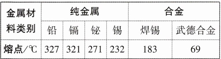 7. (教材批判性思维改编)下表是有关焊锡(锡和铅)和武德合金(铋、铅、锡、镉)的熔点及组成金属的熔点数据。