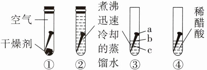 。(3)试管③中,比较a、b、c三处,生锈最明显的地方是