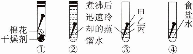 (填序号,下同)中的现象可知,铁钉生锈需要与水接触。(3)(实验细节)试管②中加入的蒸馏水需经煮沸并迅速冷却,其目的是